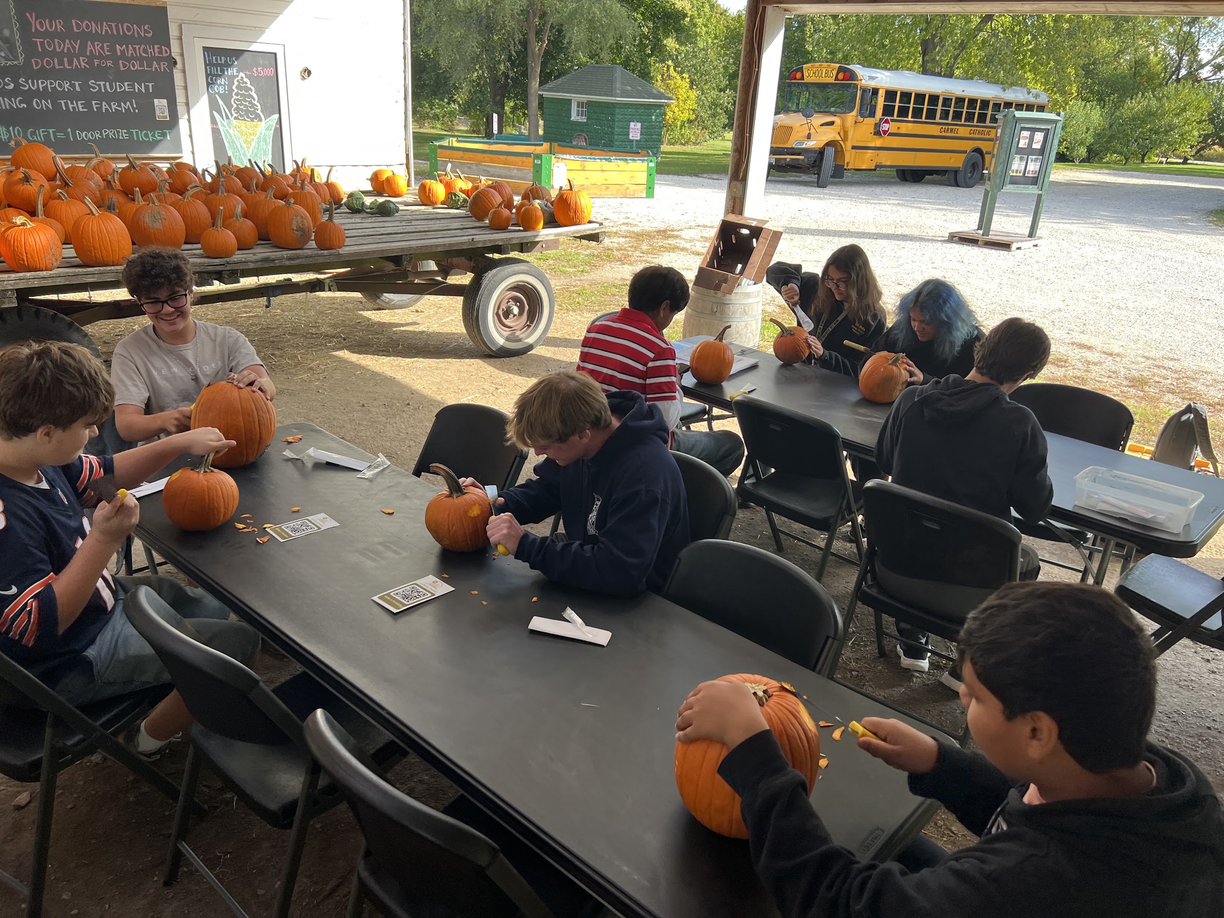 Student gently pre-carve pumpkins for chickens to enjoy