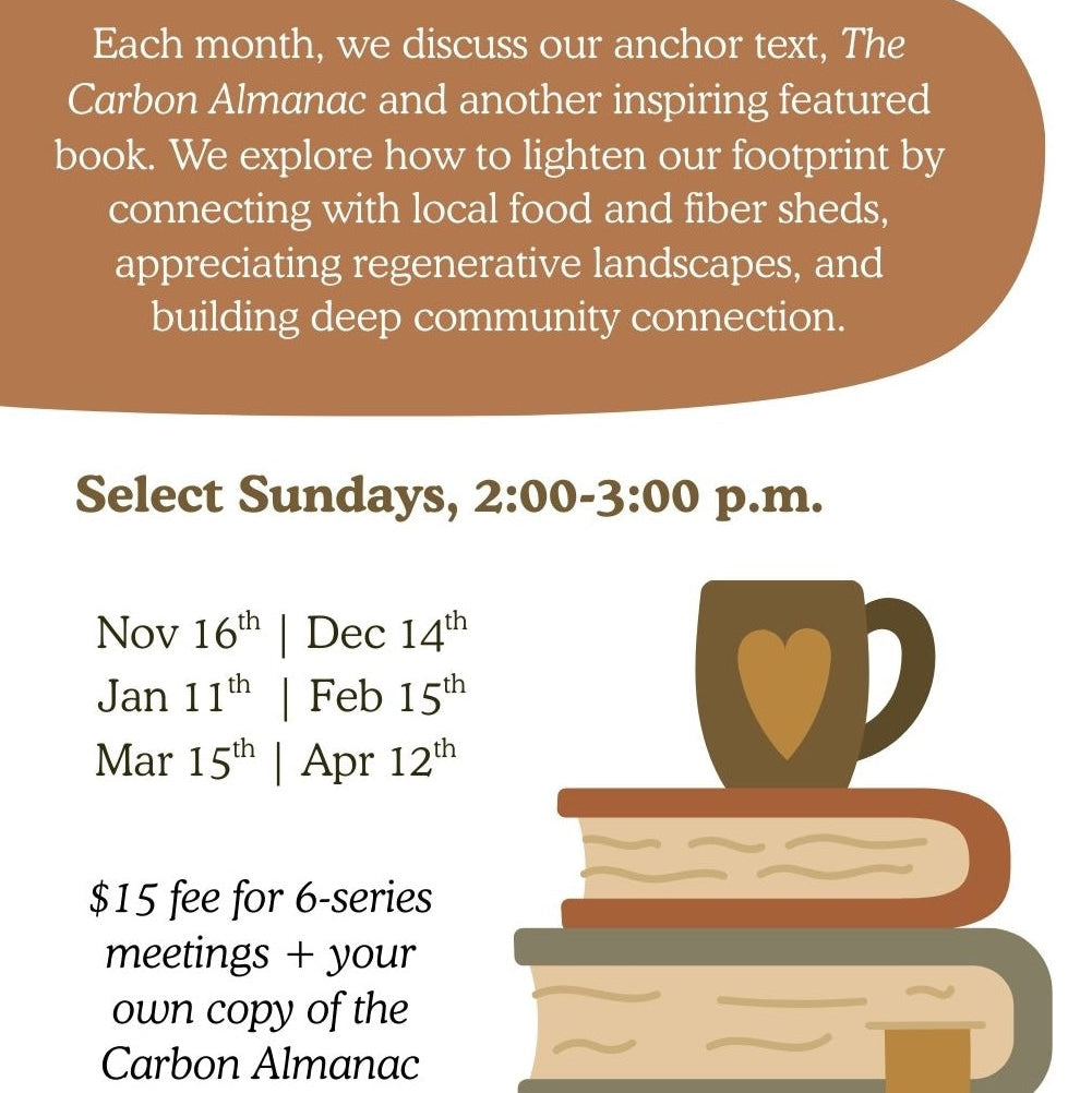 Each month, we discuss our anchor text, The Carbon Almanac and another inspiring featured book. We explore how to lighten our footprint by connecting with local food and fiber sheds, appreciating regenerative landscapes, and building deep community connection.